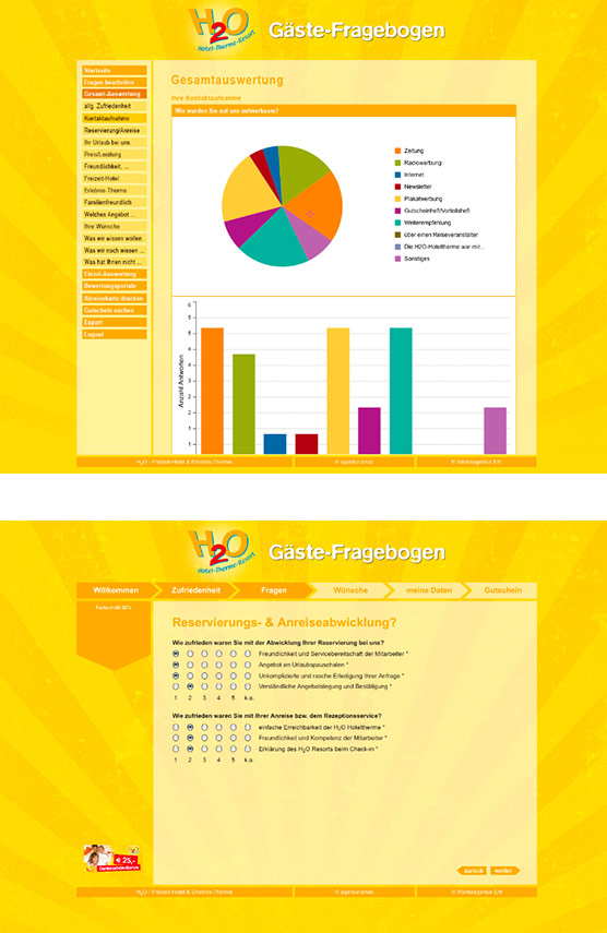 Das Stammkundenmodul ist eine von uns entwickelte Software, die bei der H2O Therme zum Einsatz kam. Die Software sorgt für mehr positive Hotel-Bewertungen auf Bewertungsplattformen, eine gesteigerte Weiterempfehlungsrate und ein verbessertes Suchmaschinenranking auf Google. Außerdem stellt das Stammkundenmodul dem Hotelier viele hilfreiche Funktionen wie z.B. einen automatisierten Gäste-Fragebogen zur Verfügung und kann auch als Marktforschungs-Tool eingesetzt werden. Durch Anbindung an die Hotelsoftware werden die Arbeitsabläufe für den Hotelier extrem vereinfacht und der Arbeitsaufwand gesenkt.