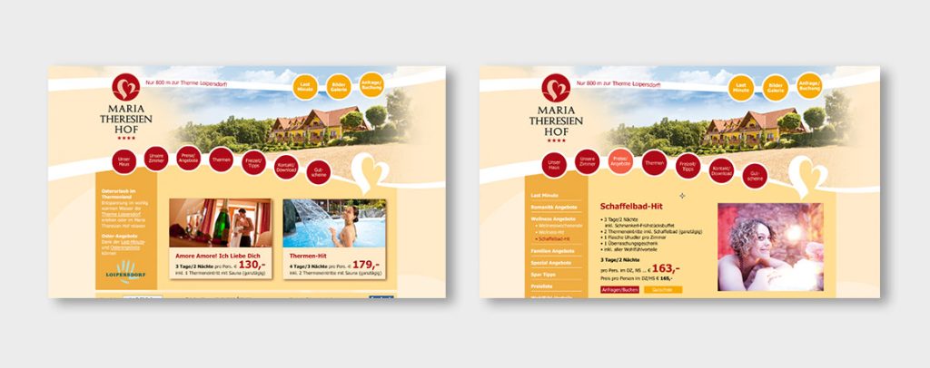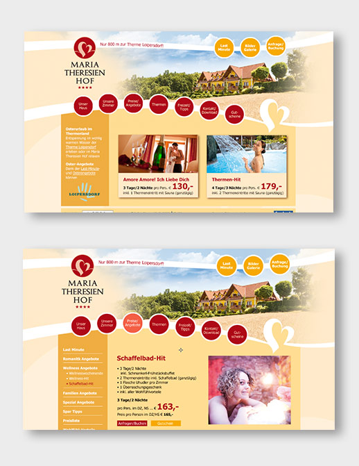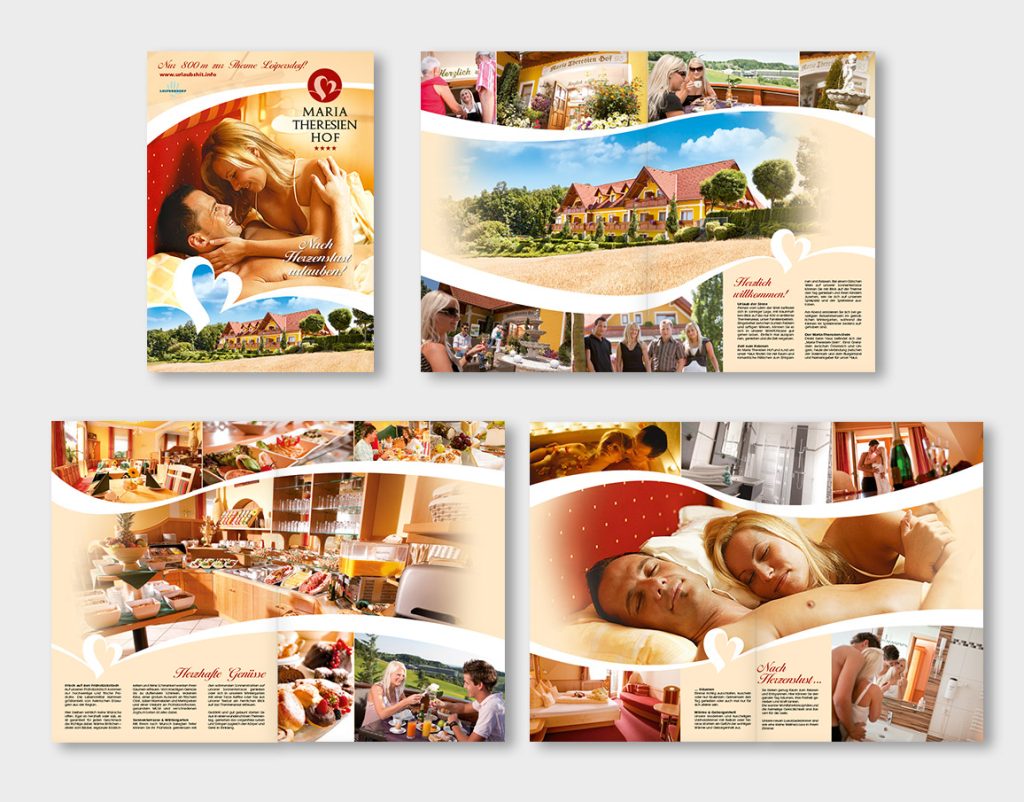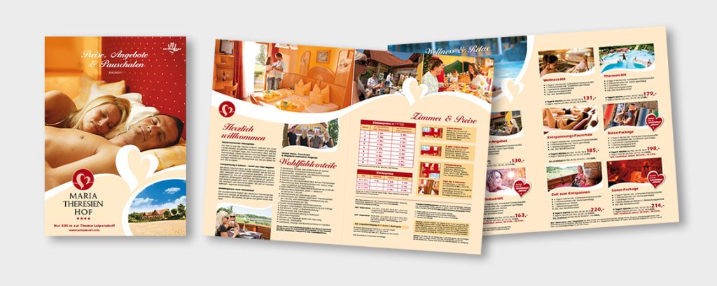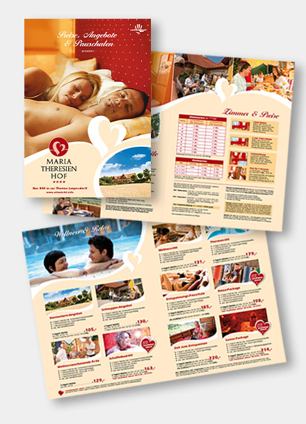 Logo & CD-Entwicklung, Imageauftritt, Image-Prospekt, Inserate, Mailings, Werbeaktionen, Website-Entwicklung und laufende Befüllung, SEO-Maßnahmen (Frontend & Backend), Newsletter, Werbetafeln, Preislisten, Kalender, Zimmerillustrationen, Fotoregie, Redesign & Weiterentwicklung des bestehenden CD